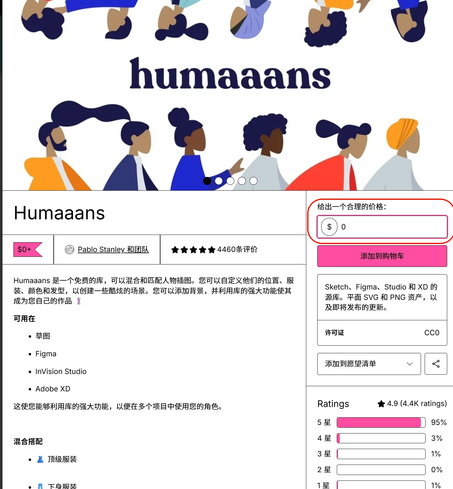 访问官方站点或 Gumroad 页面(https://pablostanley.gumroad.com/l/humaaans),在价格栏输入 0 美元即可免费下载原始库文件;