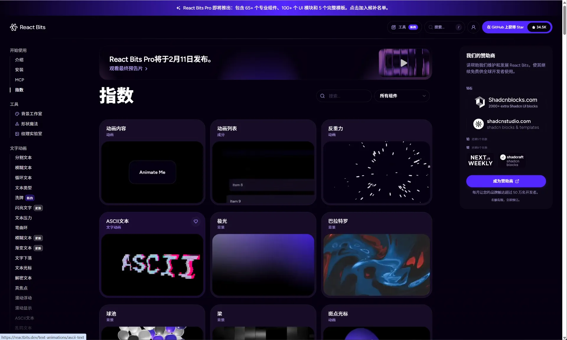 - 背景特效 (Backgrounds): 包含粒子效果、网格光束、流体背景、3D 空间等,非常适合用于 Landing Page(落地页)的头图。